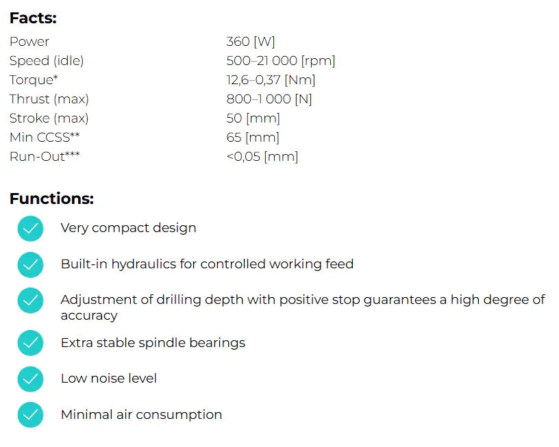 La conception de base du BE 33 comprend un moteur à palettes alimenté par air comprimé, un vérin pneumatique et un système hydraulique fermé. La course totale peut être divisée en avance rapide et avance de travail sur toute la plage. Le clapet anti-retour du système hydraulique permet un réglage précis de l'avance et du retour rapide.
