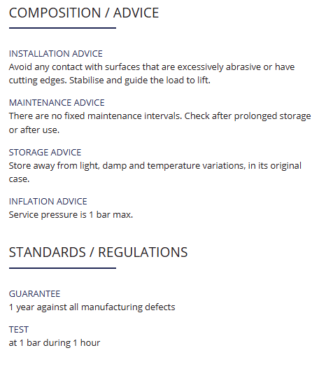 La grande surface de contact du système permet de répartir la force de levage sur une plus grande surface. Les accessoires spécifiques à cette gamme permettent de sécuriser la pression de gonflage jusqu'à 1 bar.