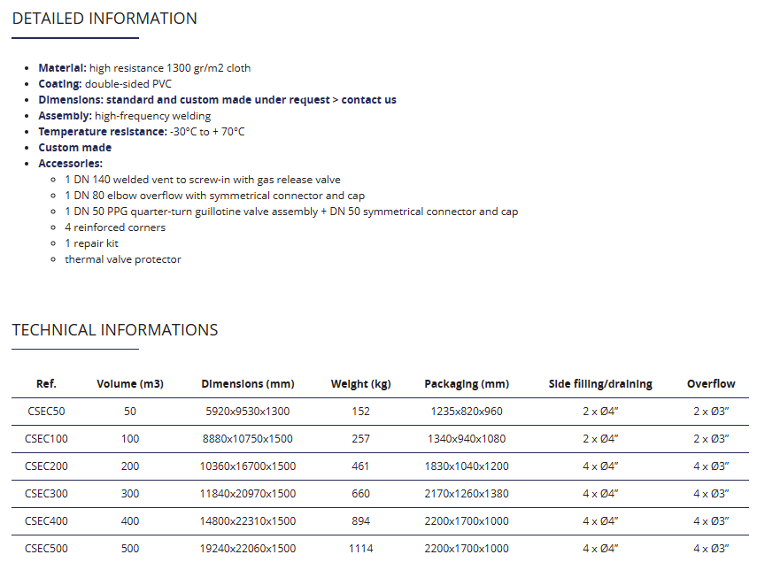 Ce réservoir d'effluents est résistant : il est fabriqué en toile enduite de PVC spécifique au stockage des effluents et assemblé par soudure haute fréquence. Son tissu enduit haute résistance est également compatible avec la plupart des liquides acides ou basiques. Ces réservoirs d'effluents flexibles peuvent stocker :
