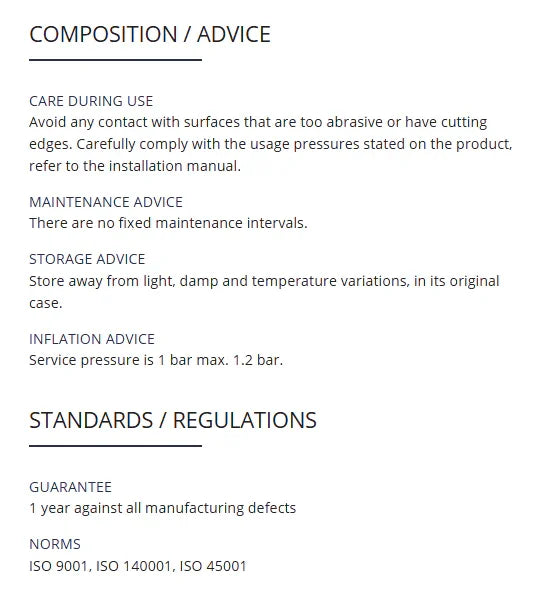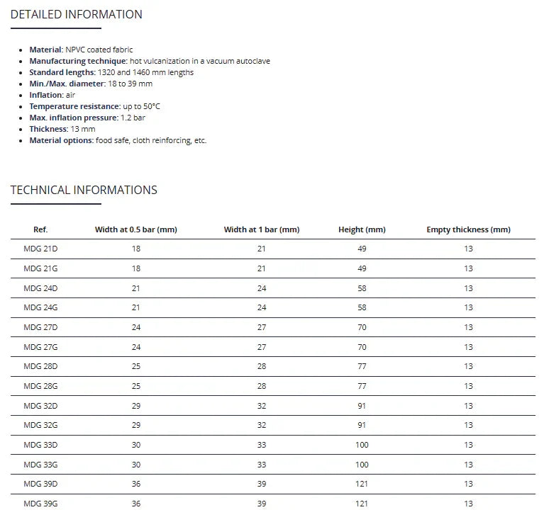 Un revêtement alimentaire peut être ajouté sur demande. Selon vos besoins d'installation, d'autres options peuvent être ajoutées aux anneaux gonflables, telles qu'un renforcement, une double alimentation en air comprimé, une hauteur de tige filetée, etc.