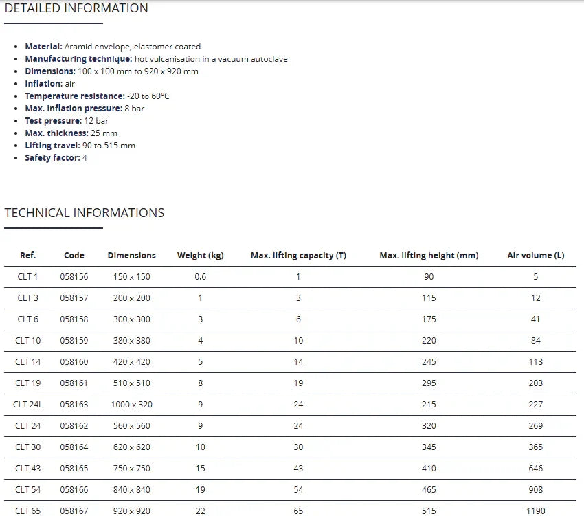 Coussins de levage pneumatiques - Coussins de levage pneumatiques haute pression - CLT