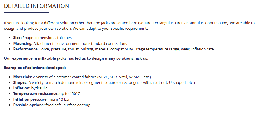 Les vérins gonflables sont la solution idéale pour les applications nécessitant une force de levage élevée à une hauteur définie. Ce coussin de levage a une capacité de levage allant jusqu'à plusieurs dizaines de tonnes. De plus, il peut être gonflé à l'air, à l'eau ou à l'huile. Pronal peut fabriquer des vérins gonflables spéciaux aux dimensions sur mesure, permettant ainsi d'obtenir des cylindres flexibles aux formes spécifiques.