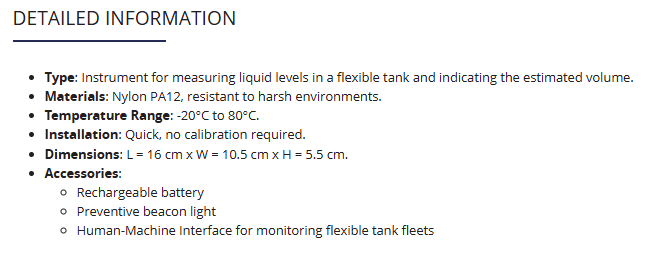 Le capteur de niveau Pronal est une solution avancée conçue pour la surveillance précise et en temps réel des niveaux de liquide et des volumes correspondants dans les réservoirs souples. Grâce à sa technologie, ce capteur assure une gestion optimale des ressources disponibles, qu'il s'agisse d'eau, de carburant, d'huile ou de tout autre fluide industriel. Adaptable à tous types de réservoirs et de liquides, il constitue une solution idéale pour divers secteurs industriels ayant des besoins spécifiques en matière de surveillance des volumes de liquide.