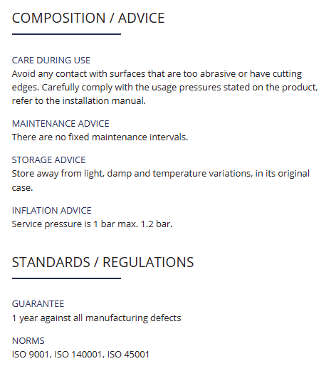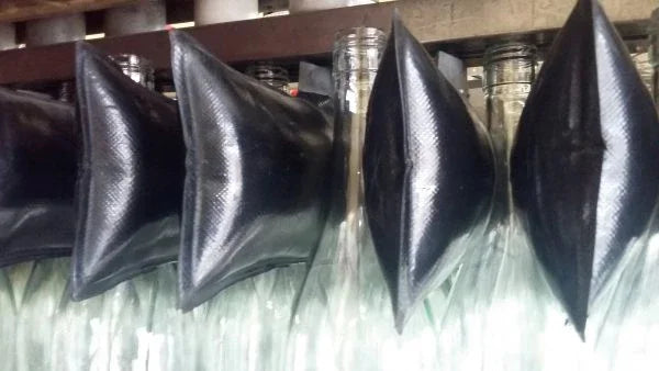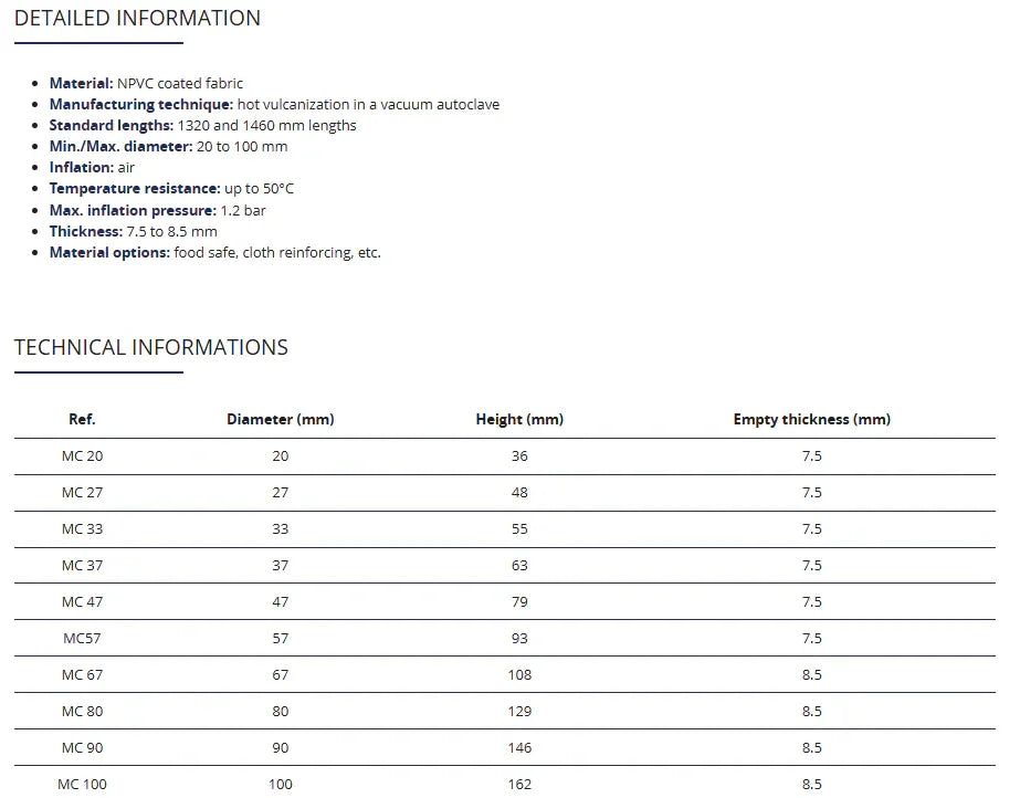 Les longueurs standard sont de 1 320 mm et 1 460 mm. Alimentés en air, ces anneaux gonflables permettent de manipuler des couches de bouteilles en pinçant leur goulot. Leur large surface de contact et leur finition textile douce, au plus près du goulot, évitent tout basculement.