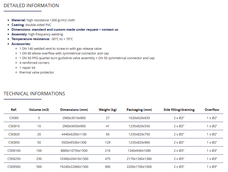 Comme nos autres réservoirs, il est fabriqué en tissu enduit PVC haute résistance (1 300 g/m²) et assemblé par soudure haute fréquence. Ce tissu résiste à toutes les températures, de -30 °C à +70 °C.