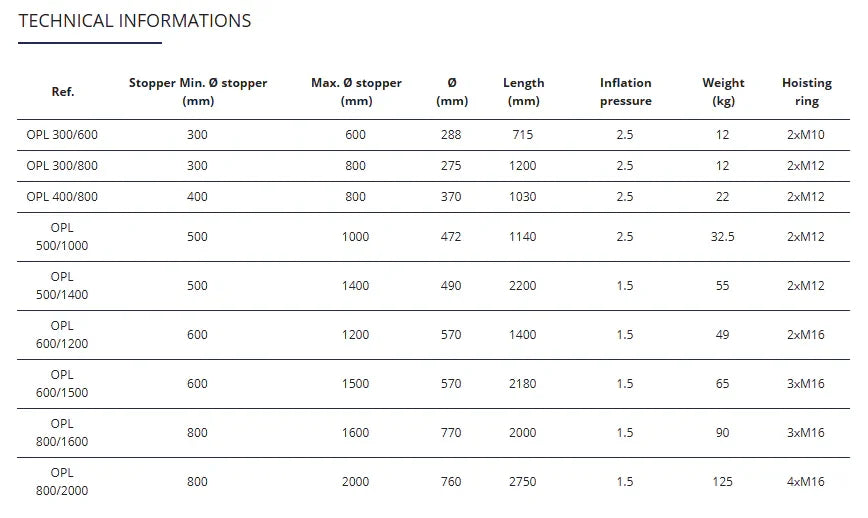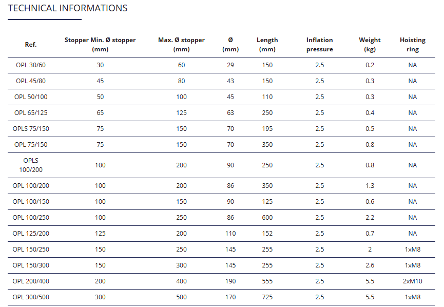 De nombreuses tailles sont disponibles pour couvrir des canalisations de 30 à 2000 mm de diamètre. Grâce à ces différents diamètres, ce ballon obturateur peut être utilisé dans de nombreux domaines : réseaux d'assainissement, eaux pluviales et eaux usées avec la gamme NR, ainsi que pour les hydrocarbures et/ou les produits chimiques avec la gamme NBR.