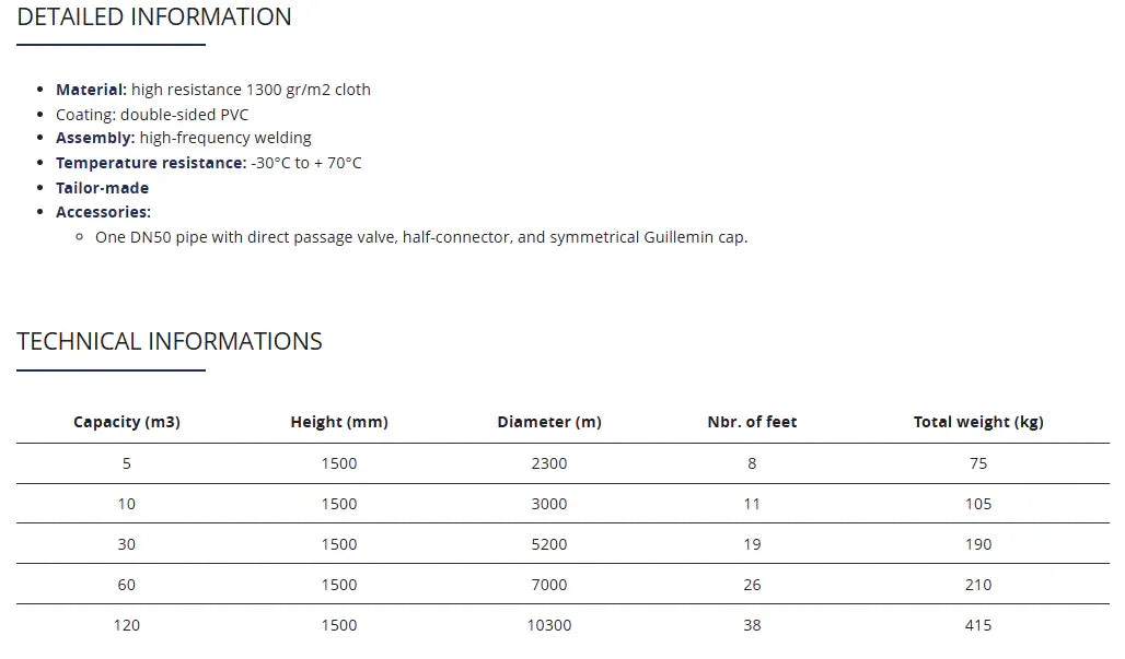 Avec une capacité volumique allant de 5 m3 à 120 m3 – voire plus grâce à la possibilité de cuves sur mesure – vous pouvez stocker une grande quantité d’éléments.