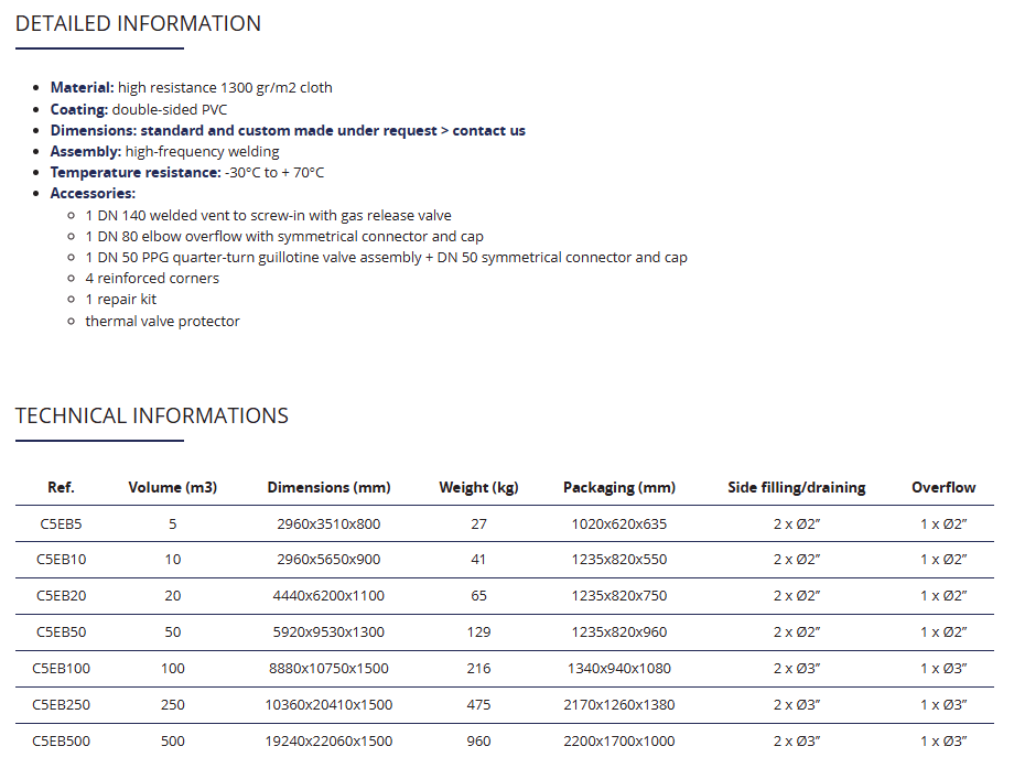 La citerne souple Pronal peut être utilisée, de manière temporaire ou permanente, comme réservoir d'eau pour les chantiers. Simple et rapide à installer, elle est également très légère et donc facilement transportable. Fabriquée en toile enduite de PVC haute résistance (1300 g/m²) et assemblée par soudure haute fréquence, elle préserve efficacement l'eau et prévient ainsi toute évaporation. Ce tissu résiste à des températures allant de -30 °C à +70 °C. La capacité de stockage de cette gamme de citernes s'étend de 5 à 500 m³.