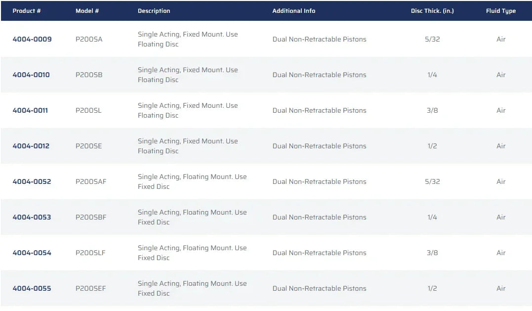 Série 200, frein à disque à étrier pneumatique à simple effet dimensionné pour un disque de frein de 3/8 pouces d'épaisseur.
