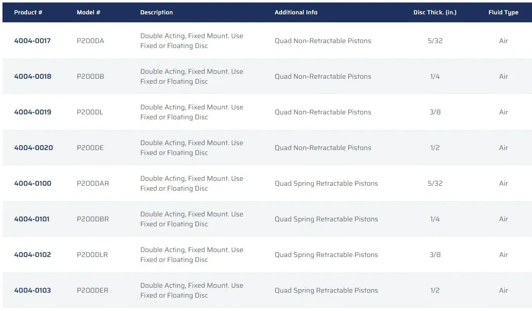 Frein à disque à étrier pneumatique à double effet série 200 dimensionné pour un disque de frein de 3/8 pouces d'épaisseur.