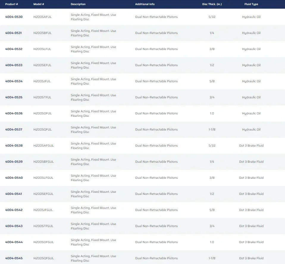 Série de disques 200 illimités, frein à disque à étrier hydraulique à simple effet avec joints EPR, dimensionné pour un disque de frein de 3/4 pouce d'épaisseur.
