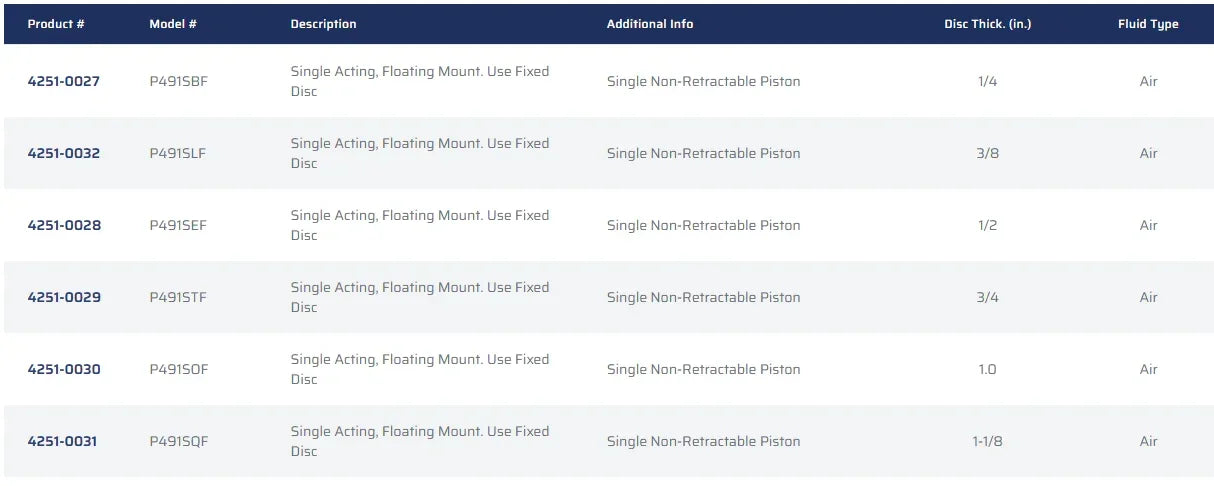Série 491, frein à disque à étrier pneumatique à simple effet avec plaques flottantes, dimensionné pour un disque de frein de 1/4 pouce d'épaisseur.