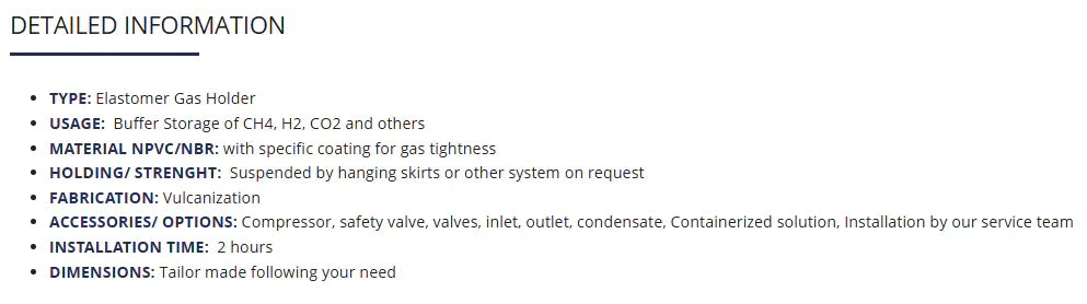 Pronal’s gas holder is an independent external storage. It allows the storage of gas with an optimal gas tightness. Indeed, this product is composed of an elastomer membrane with a specific textile coating.