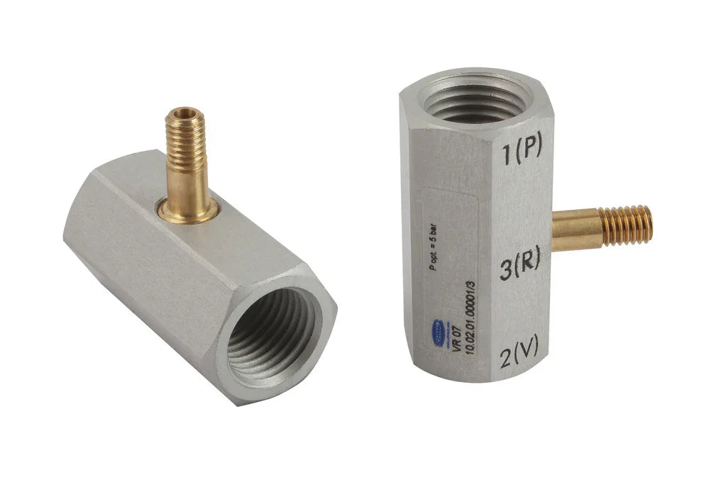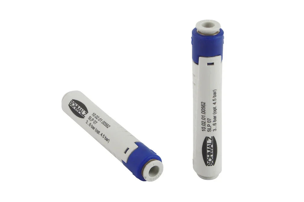 Inline ejectors are installed directly in the hose line between the compressed air supply and the suction cups.